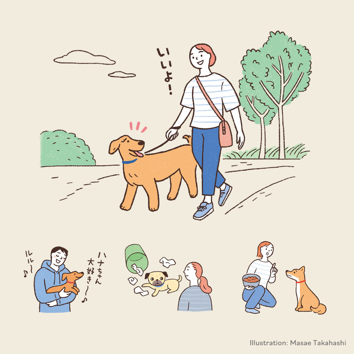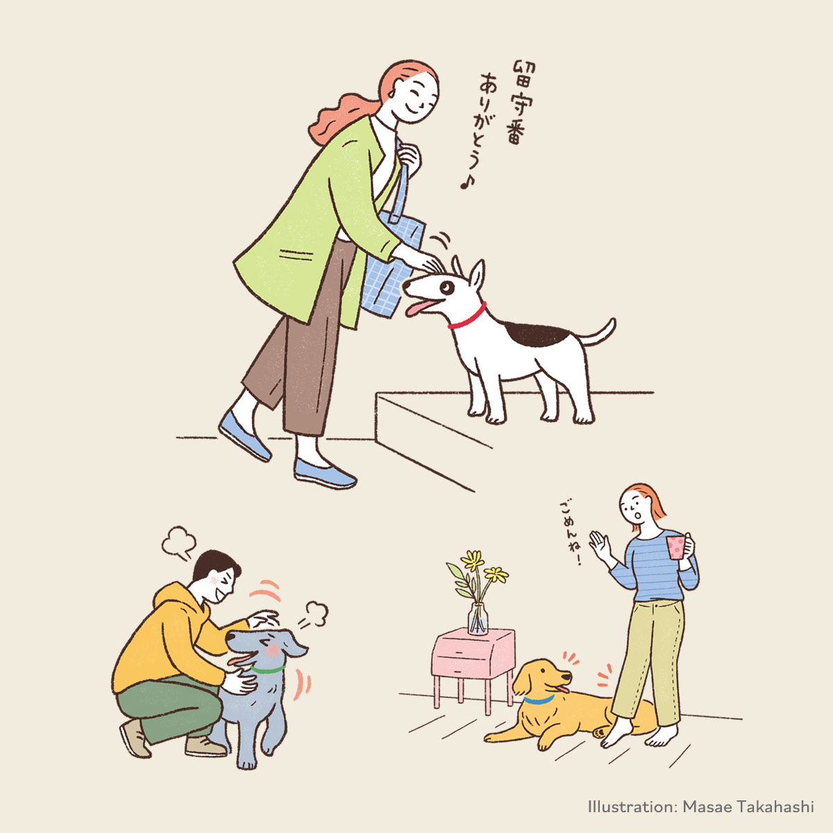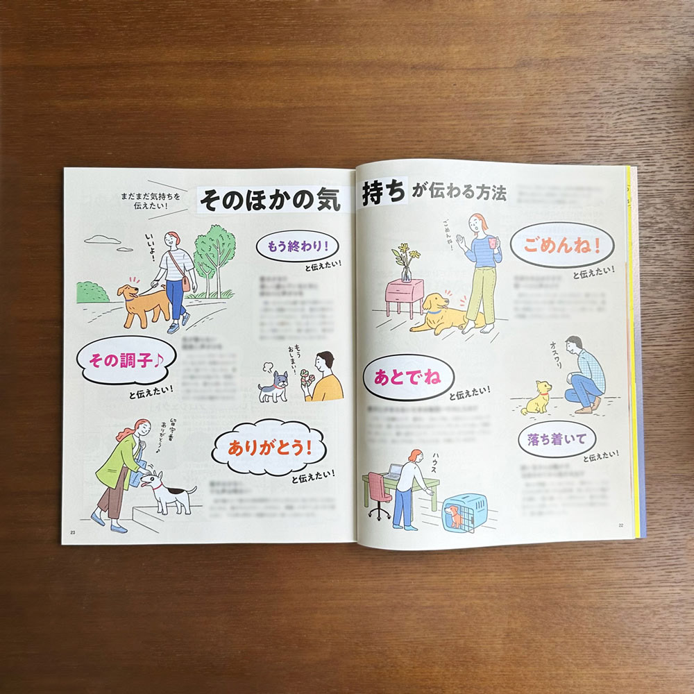 「特集 愛犬への気持ちの伝え方」のために描いたイラストです。犬が飼い主さんとコミュニケーションをとっている様子をシンプルでやさしい線画タッチで描きました。